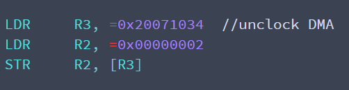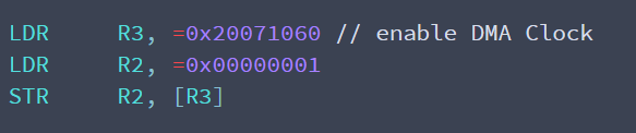 Besides powering it on, the DMA controller also requires a clock signal to operate. This is controlled by another hardware register in the same memory region.