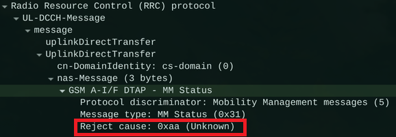 As a result, we not only successfully executed our own code on the modem side but also established full two-way communication with the modem, using the high-level NAS protocol as a means of message delivery. In this case, it is an MM Status packet with the cause field equaling 0xAA.