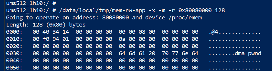 All that remains is to verify this hypothesis. To do so, we patched the MPU table again, this time adding an entry that allows read and write access to memory starting from address 0x80000000. As a result, we successfully mapped the AP’s address space into the CP’s address space. As a proof of concept, we patched the first page of the Linux kernel.