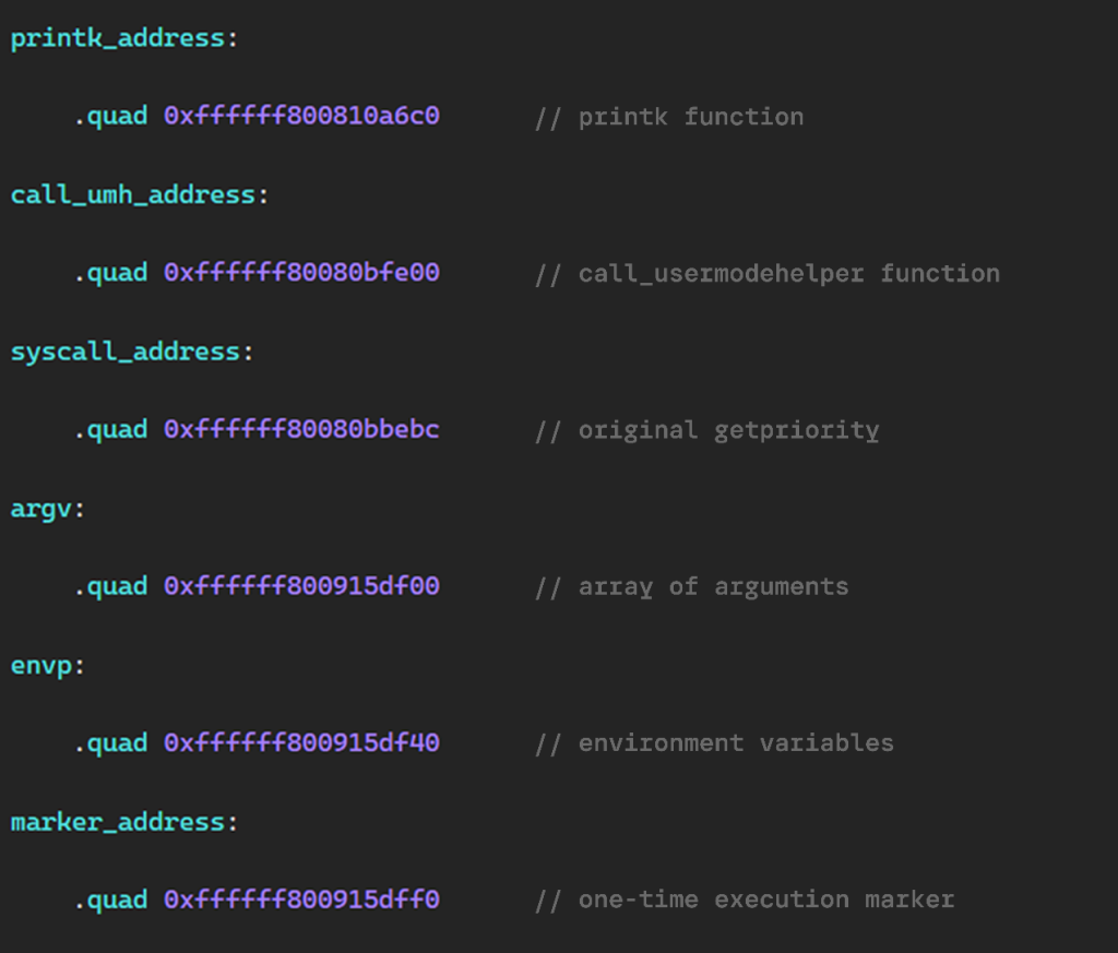 The shellcode is precompiled, position-independent machine code for the ARM64 architecture, at the end of which is a table of pointers to the necessary elements, which is populated on the modem side.