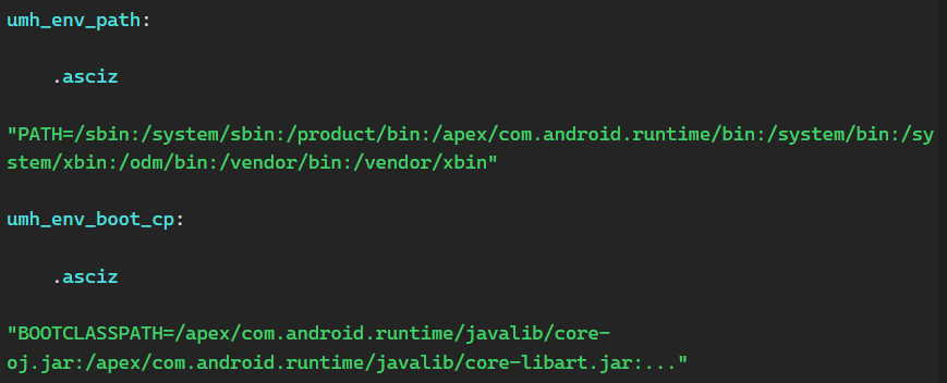 The code also contains a table of environment variables required for the correct operation of user-space processes such as am (Activity Manager), pm (Package Manager), and others.