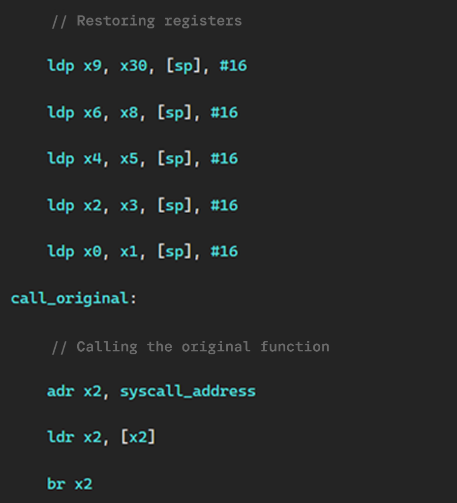 At the end of its operation, the shellcode restores the processor register state and calls the original getpriority system call.