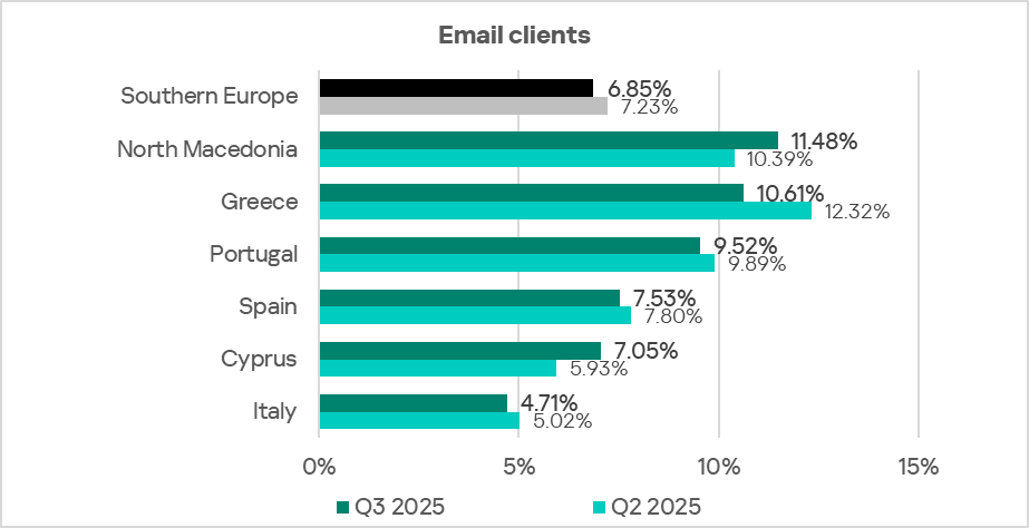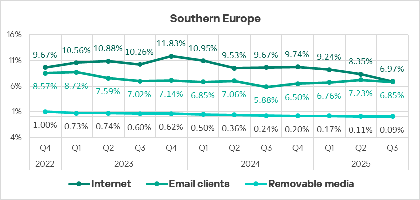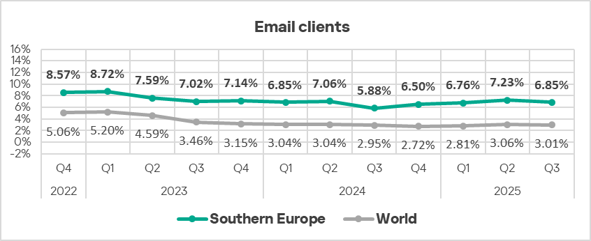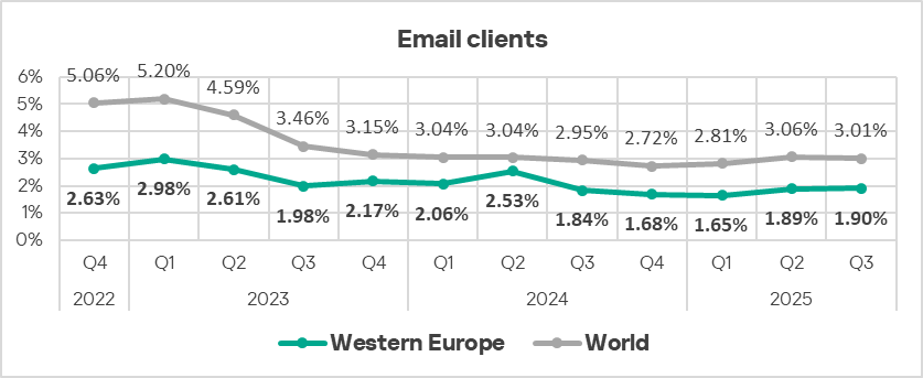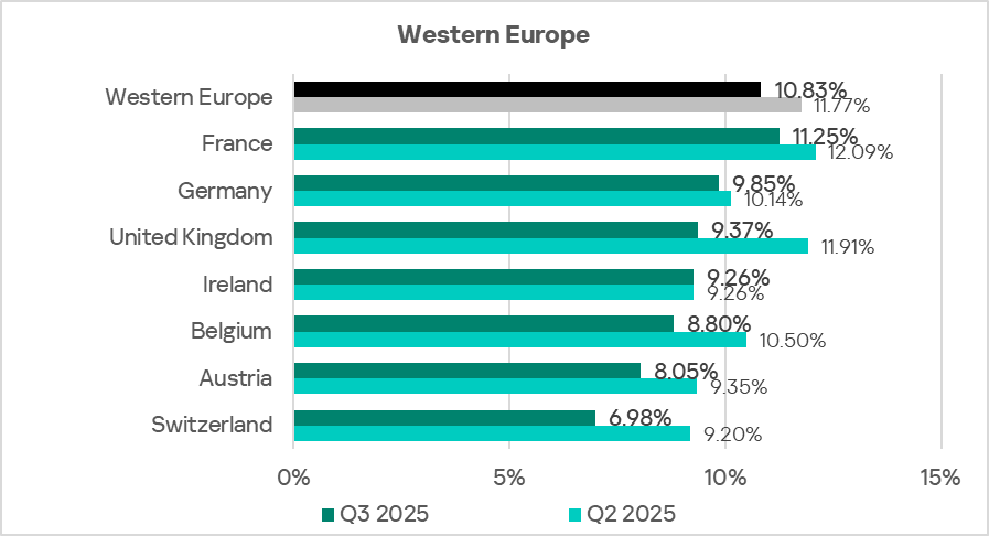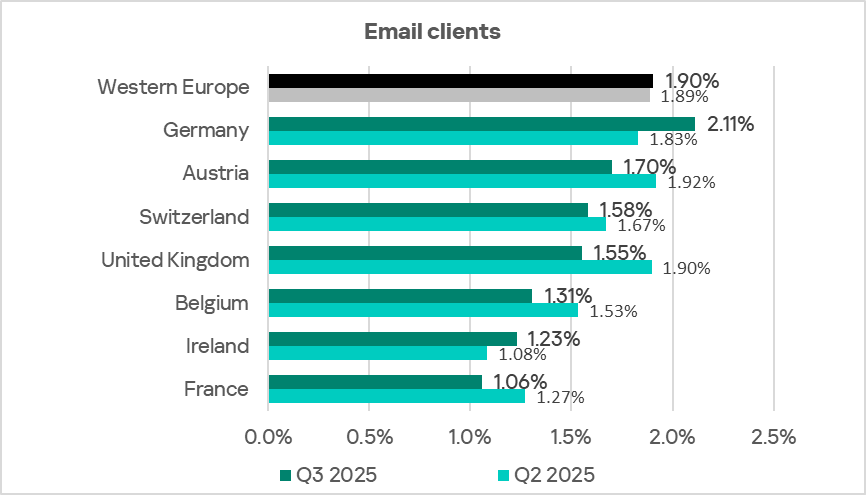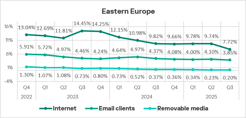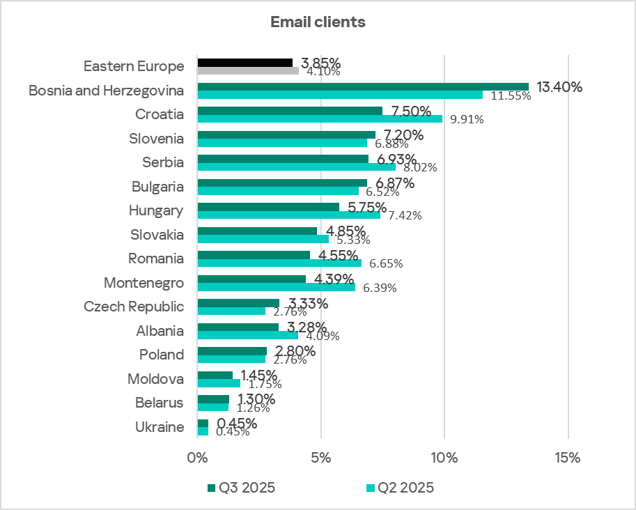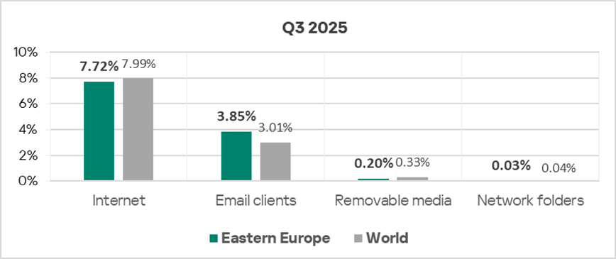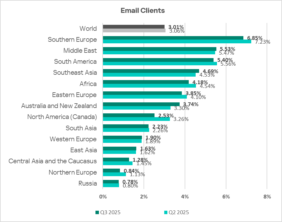 By the percentage of ICS computers on which threats from email clients were blocked, Eastern Europe ranked sixth globally in Q3 2025, at 3.85%. This is 4.9 times higher than in Russia, which ranks last.