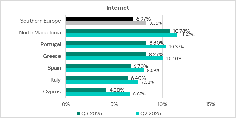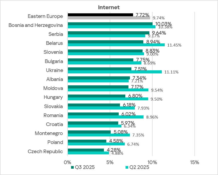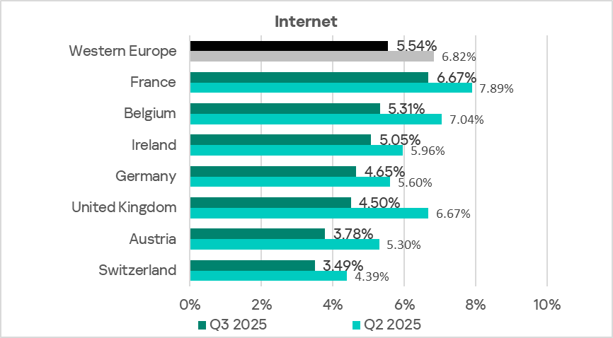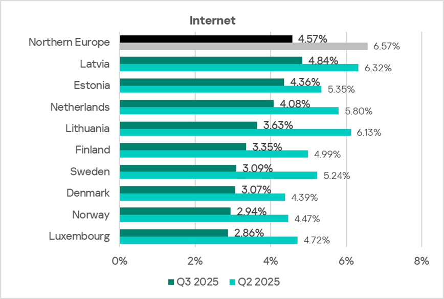 Across the region, the percentage of ICS computers on which internet threats were blocked ranges from 2.86% in Luxemburg to 4.84% in Latvia. Over the quarter, this indicator decreased in all countries of the region.