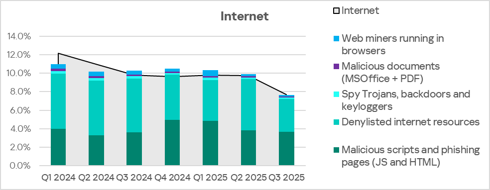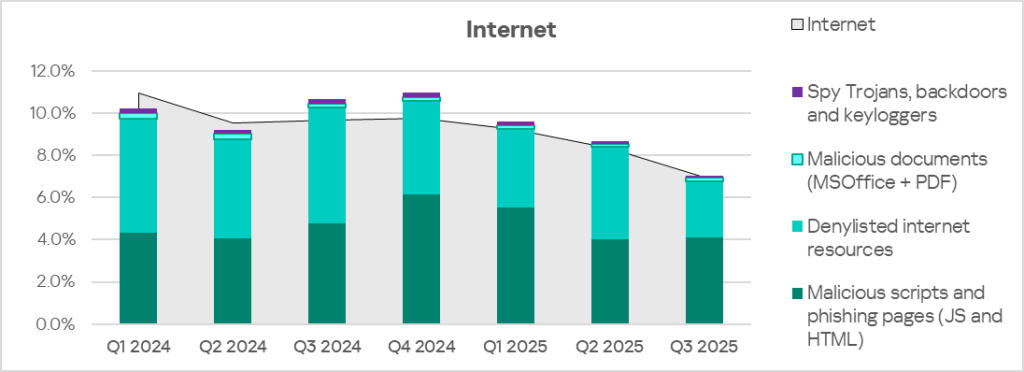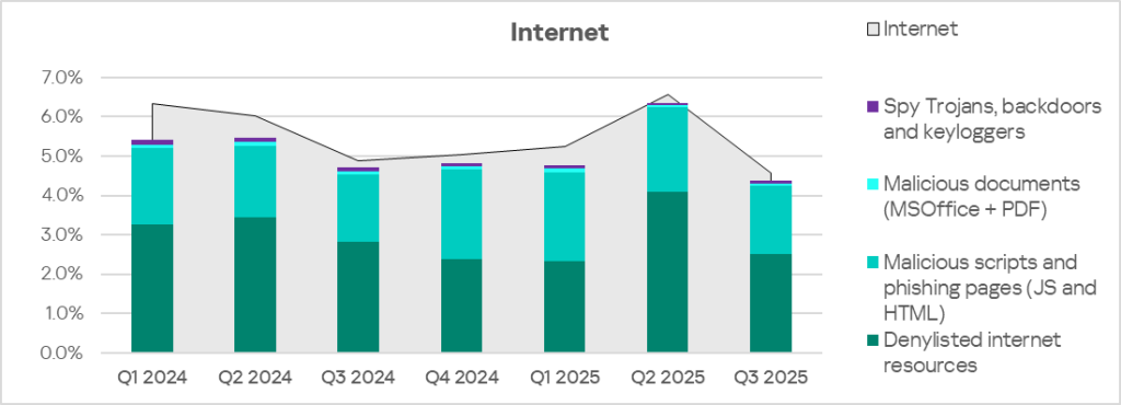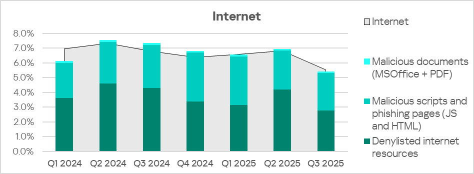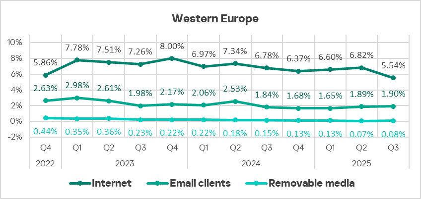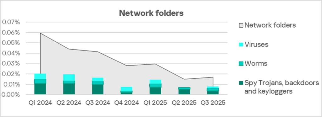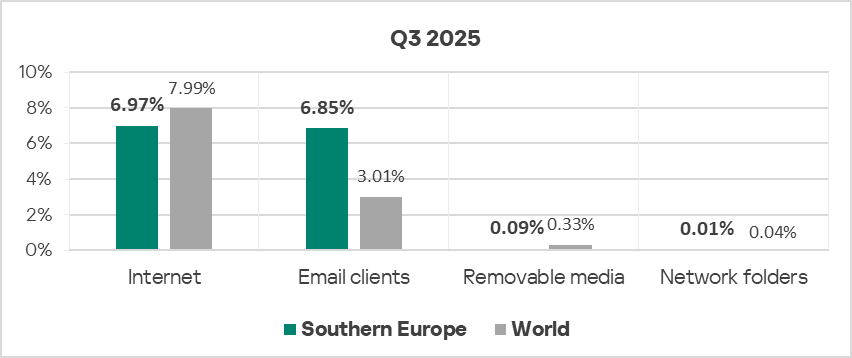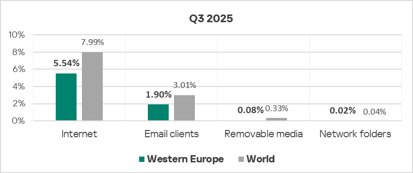 Malicious objects in the region spread primarily via the internet and email. Network folders are a minor source of threats, but in Q3 2025 among all threat sources the percentage of ICS computers on which malicious objects were blocked slightly increased only for network folders.
