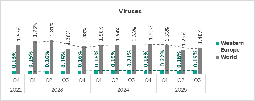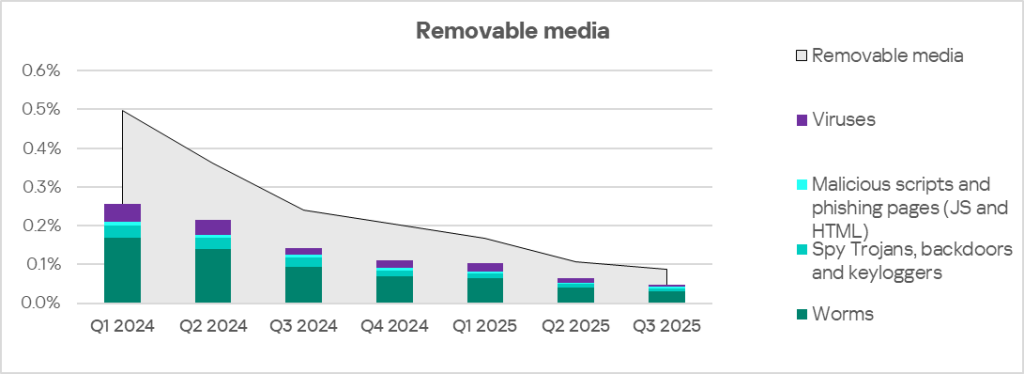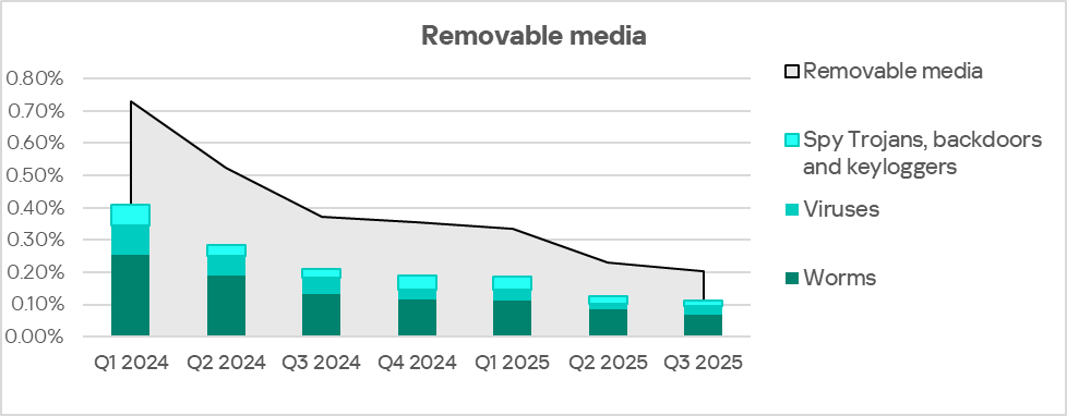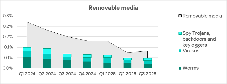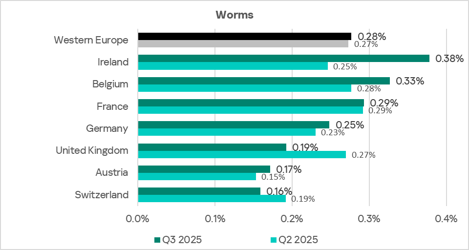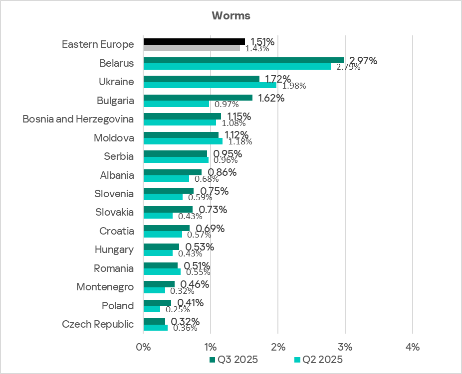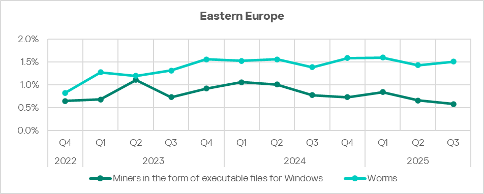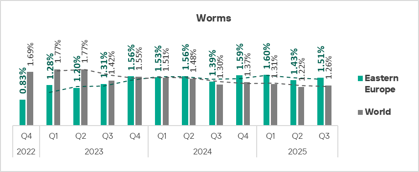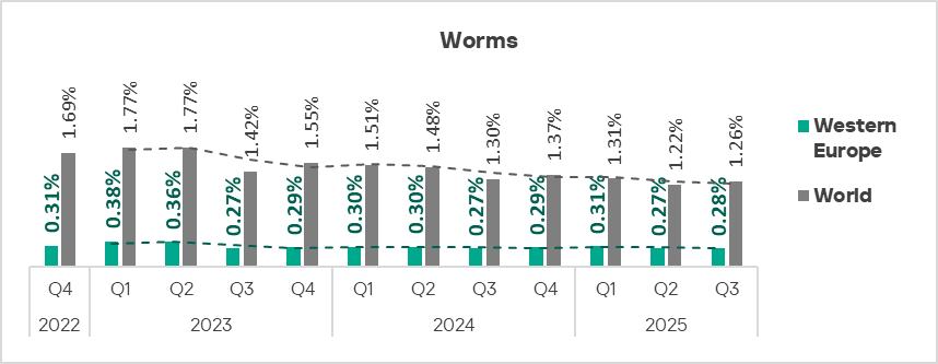 Since the end of 2023, the indicator for worms in the region fluctuates in the range of 1.4–1.6%. In Q3 2025, the percentage of ICS computers on which worms are blocked increased in the region.