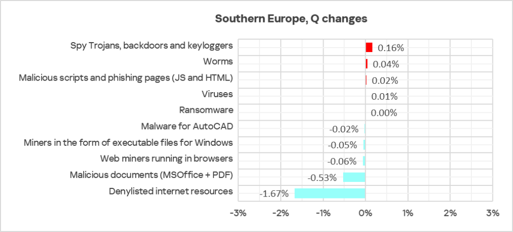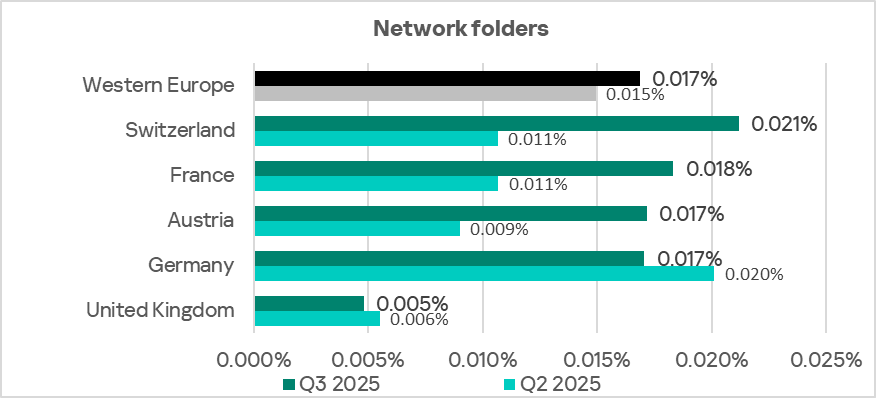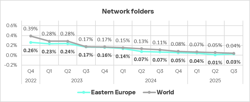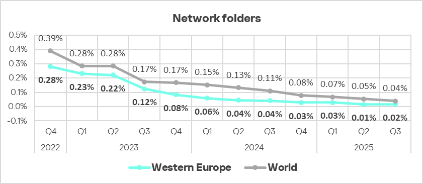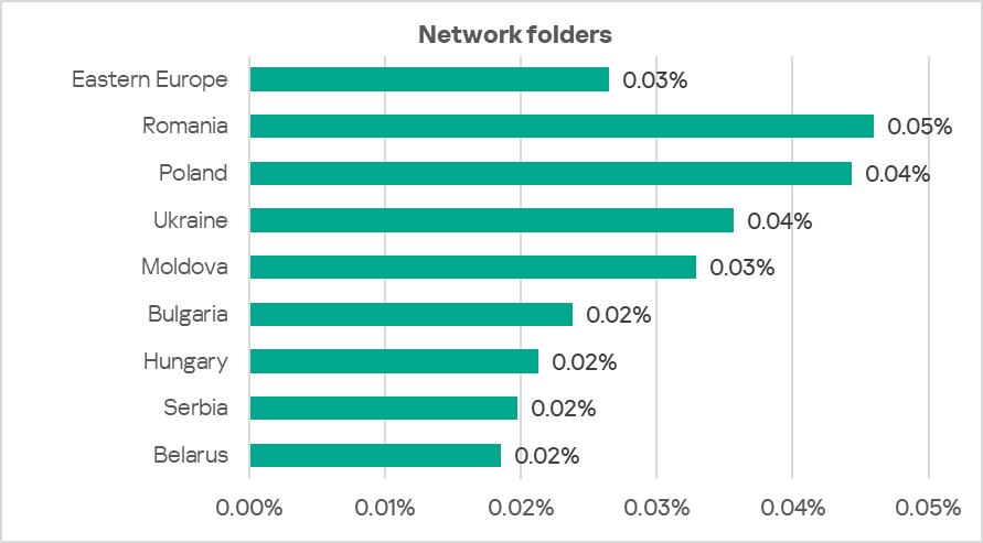 Eastern Europe rose from 13th place to fifth place in the rankings of regions in the percentage of ICS computers on which threats in network folders are blocked. Over the quarter, the network folders indicator in the region increased by a factor of 2.6 to 0.026%. This is 4.3 times higher than Northern Europe, which ranks last.
