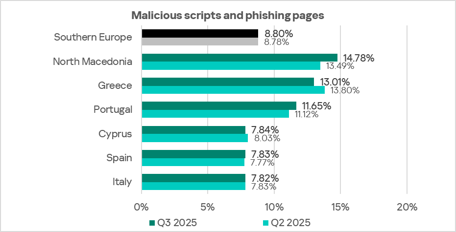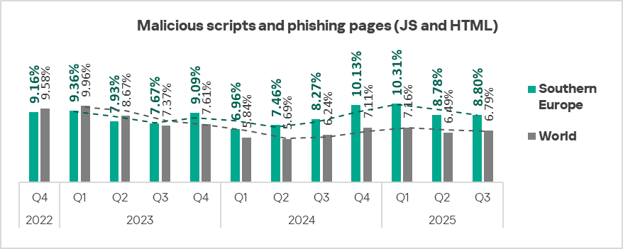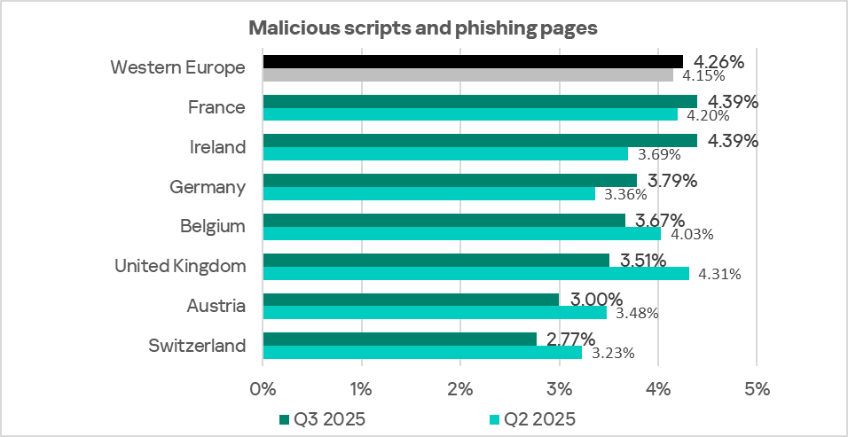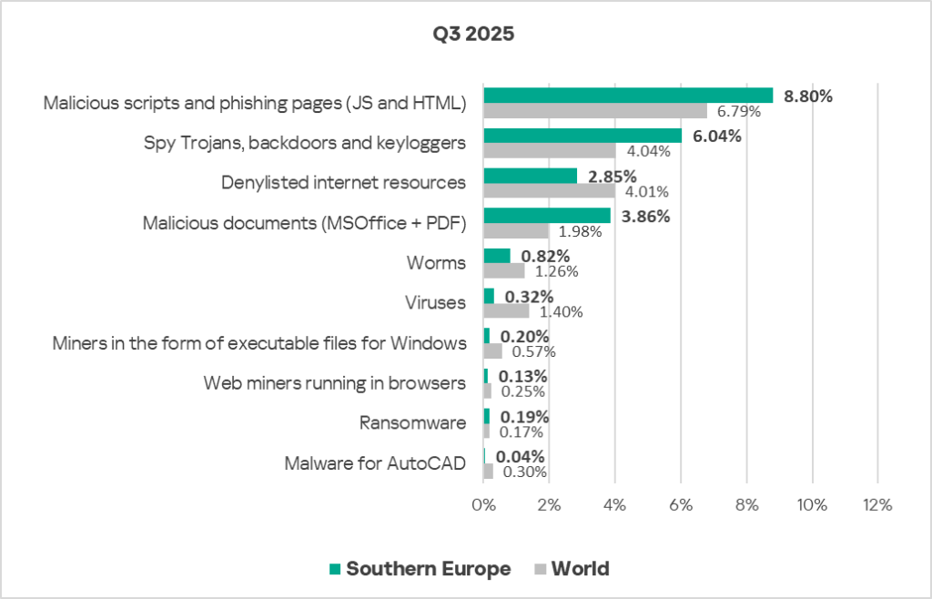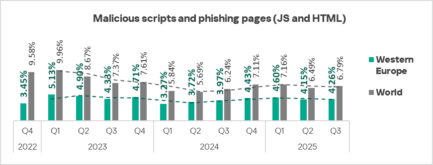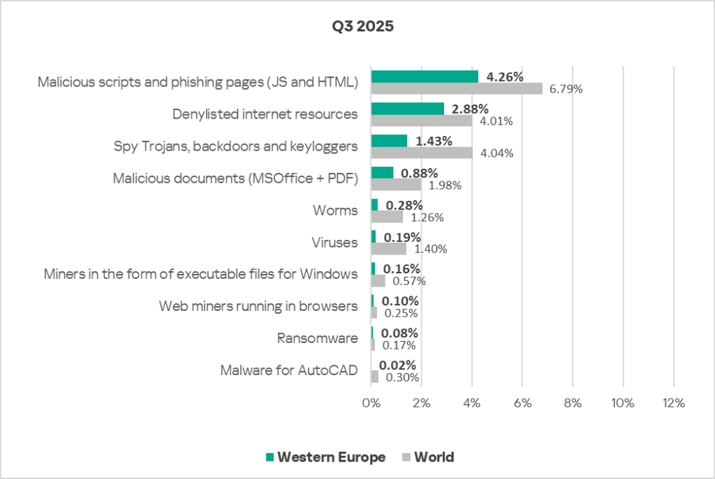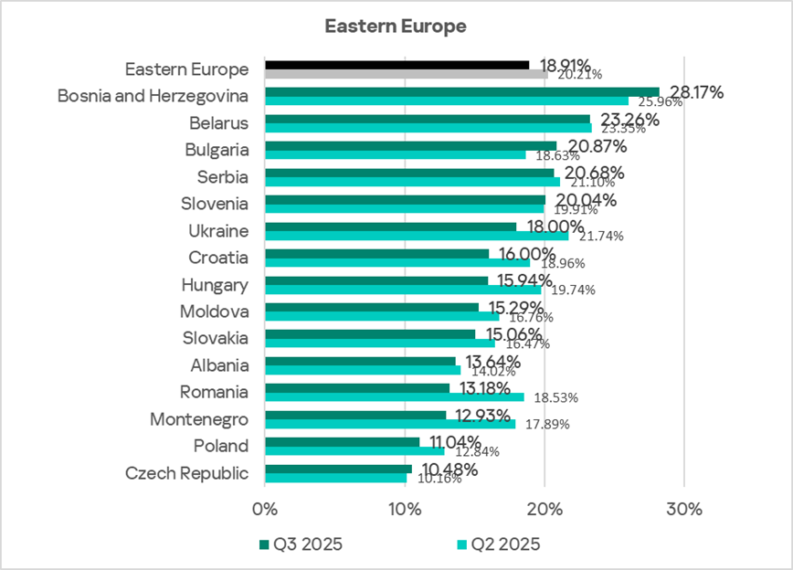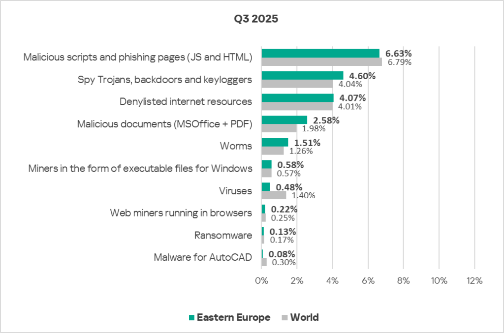 In Eastern Europe in Q3 2025, the percentage of ICS computers on which malicious scripts and phishing pages are blocked is comparable to the global average.