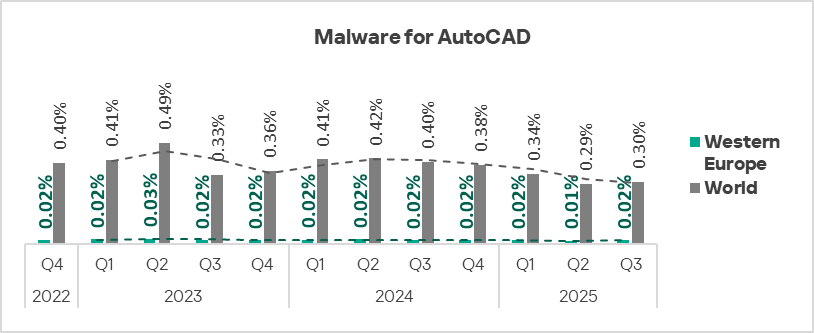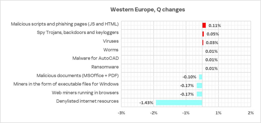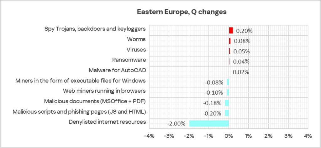 - Third place in the following threat categories: denylisted internet resources, malicious documents, spyware, miners of both categories, and malware for AutoCAD.