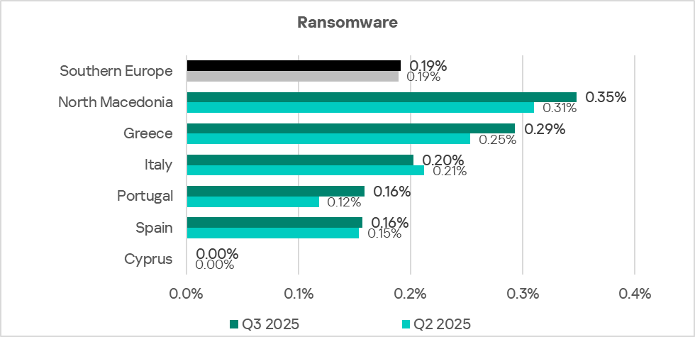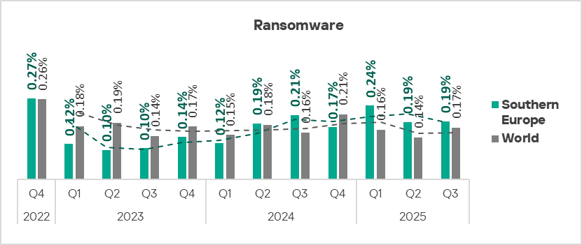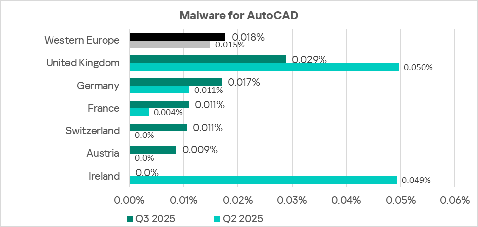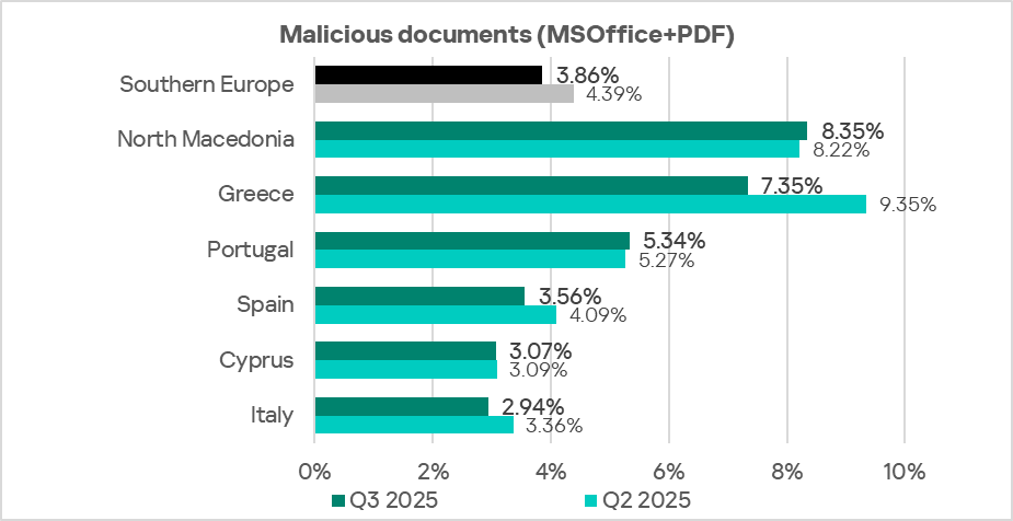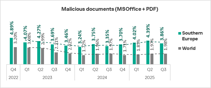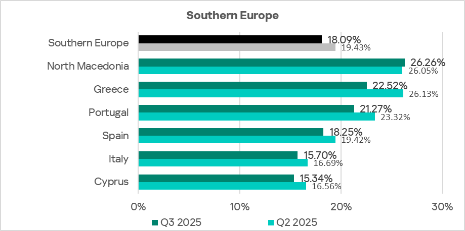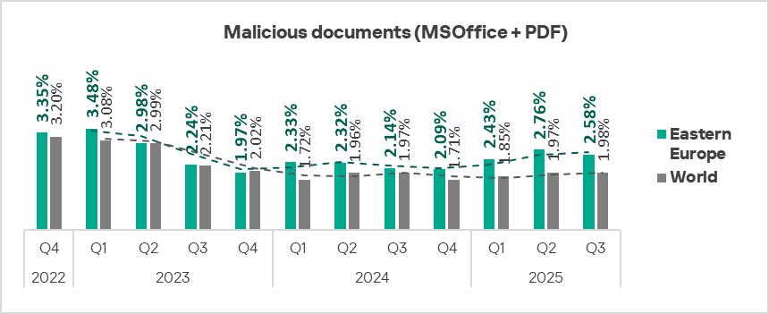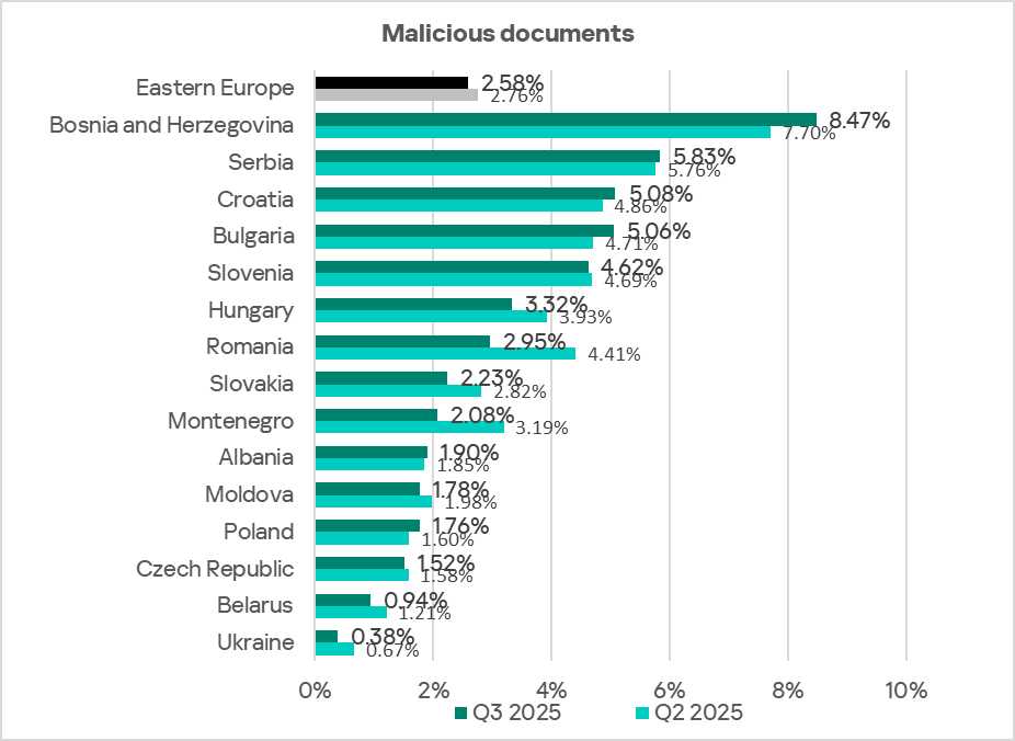Eastern Europe ranks fifth globally by the percentage of ICS computers on which malicious documents were blocked. In Q3 2025, the region’s figure was 2.58%, which is 4.9 times higher than in Northern Europe, the lowest-ranked region.