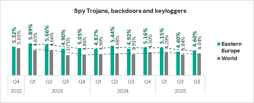 The percentage of ICS computers in Eastern Europe where spyware was blocked fluctuates over time. In Q3 2025, the indicator slightly increased after reaching its minimum during the previous quarter.