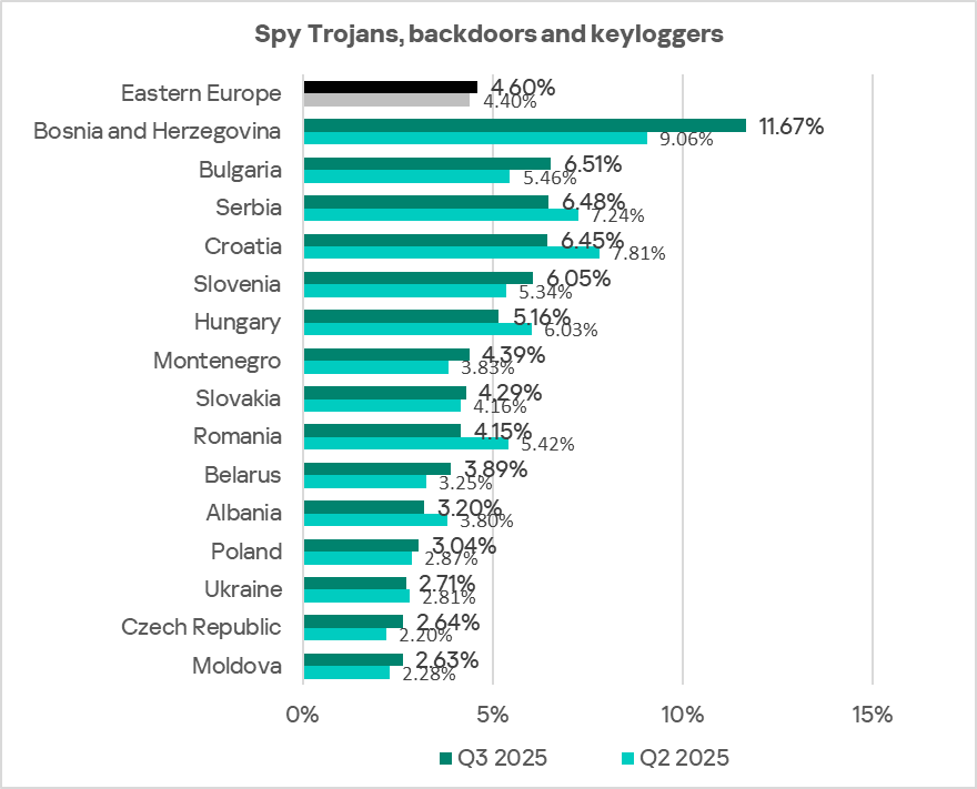 By the percentage of ICS computers on which spyware was blocked, Eastern Europe ranks sixth globally with 4.60%. This figure is 3.3 times higher than in Northern Europe, which has the lowest rate.