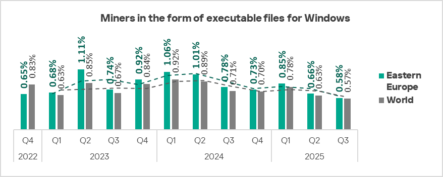 The indicators for denylisted internet resources and miners in the form of executable files for Windows slightly exceed the global averages.