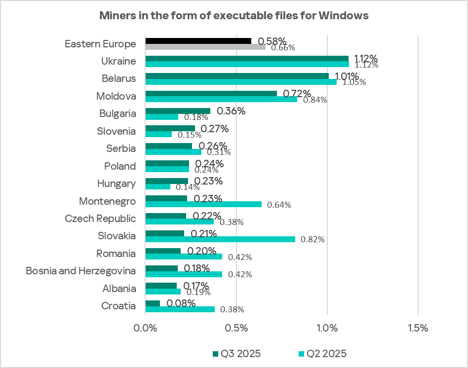 Ukraine and Belarus also lead in the ranking for miners in the form of executable files for Windows with 1.12% and 1.01%, respectively.