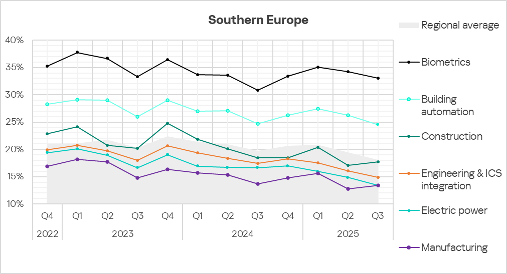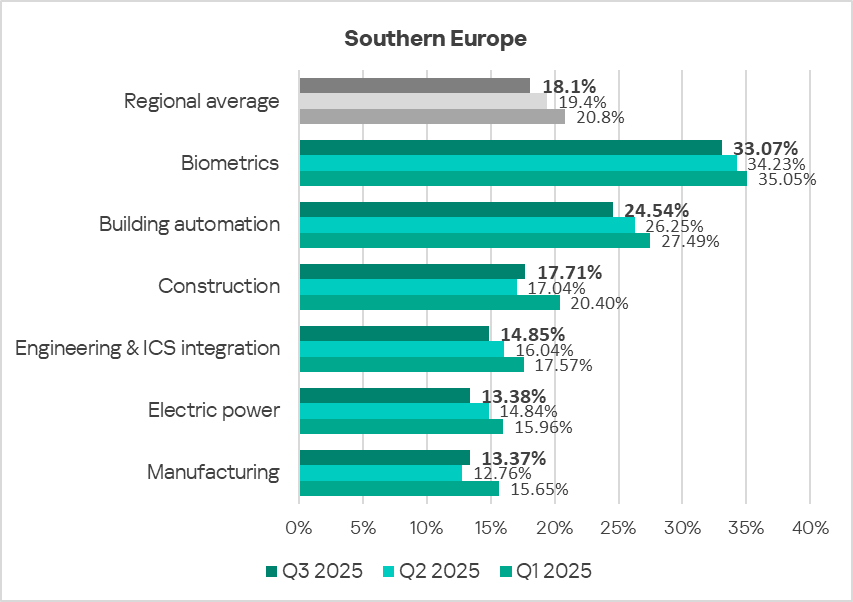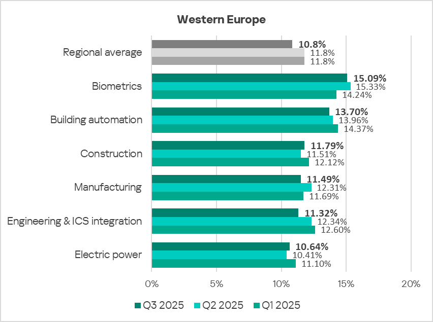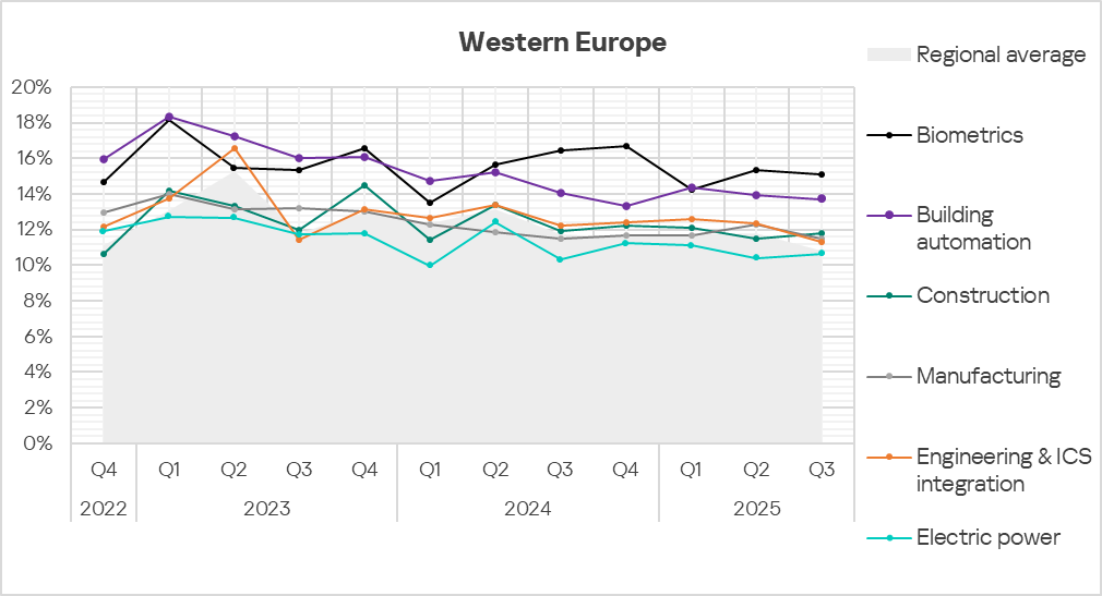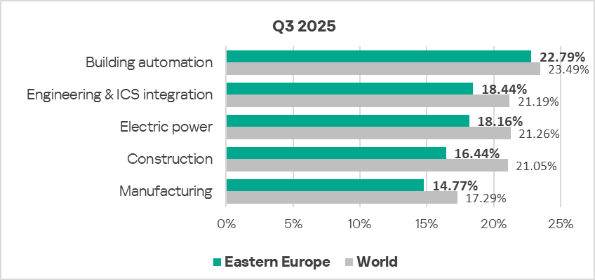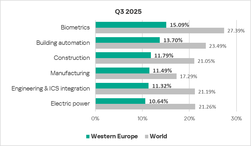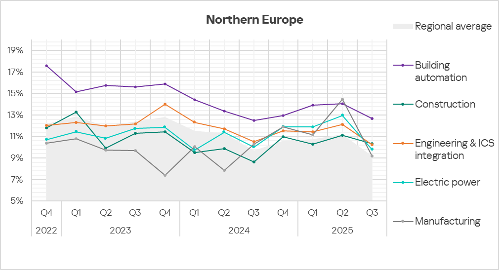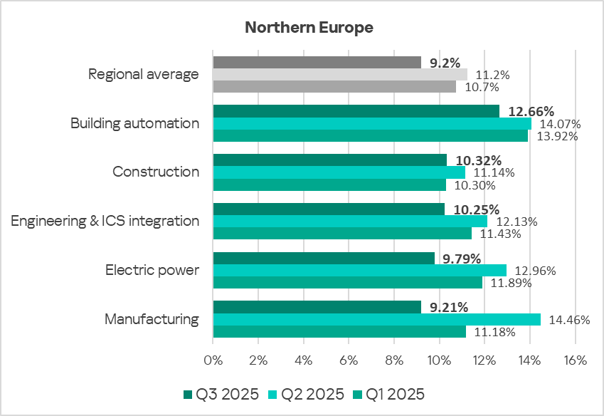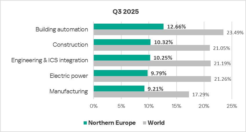 In Q3 2025, based on the percentage of ICS computers on which malicious objects were blocked, the building automation industry led the rankings of the studied industries and OT infrastructures in Northern Europe.