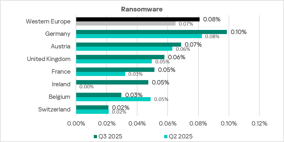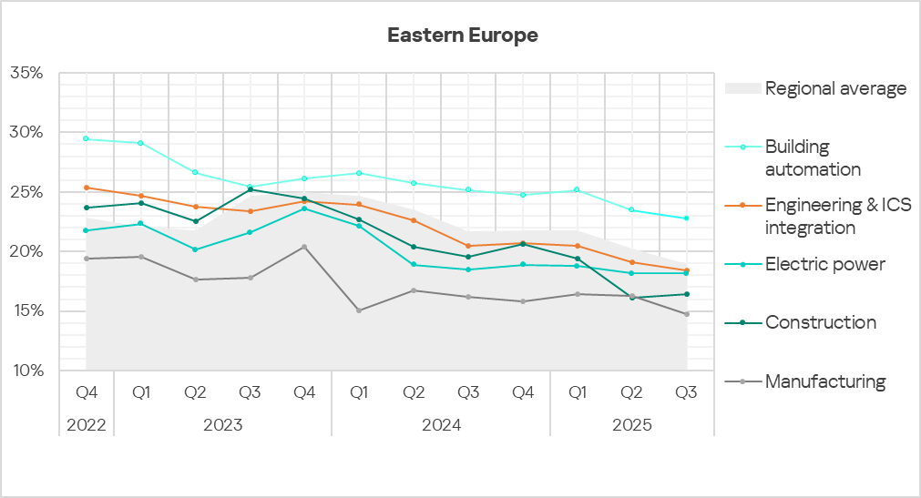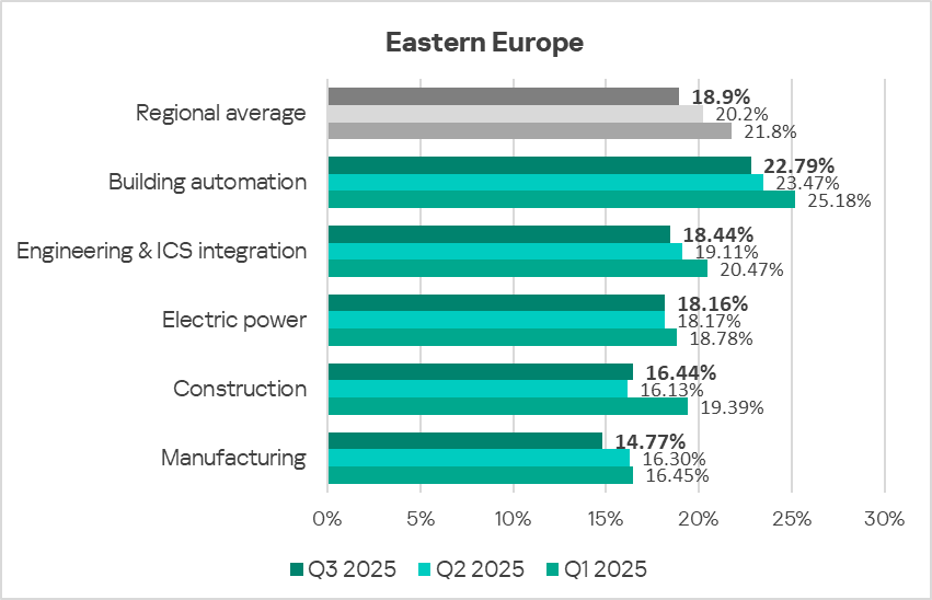 In Q3 2025, Eastern Europe ranked eighth among all regions for the percentage of ICS computers on which malicious objects were blocked. The indicator for Eastern Europe is larger than in all other European regions.