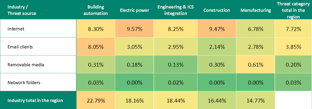 With the exception of email clients, all threat source rates in Eastern Europe are below the global average. The percentage of ICS computers on which email client threats were blocked is 1.3 times higher than the global average.