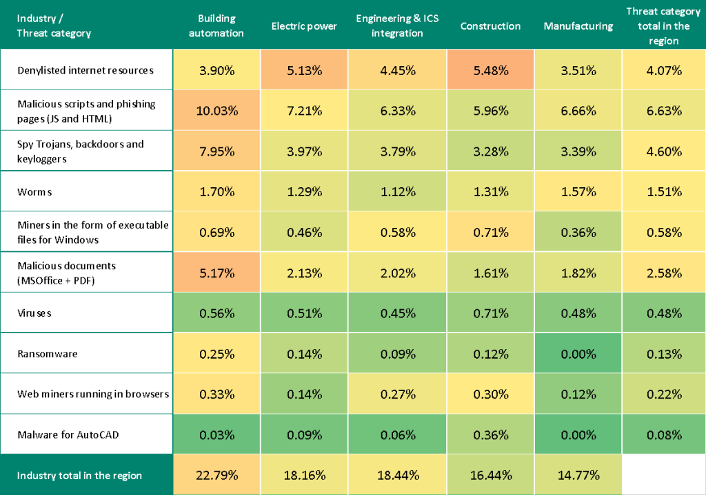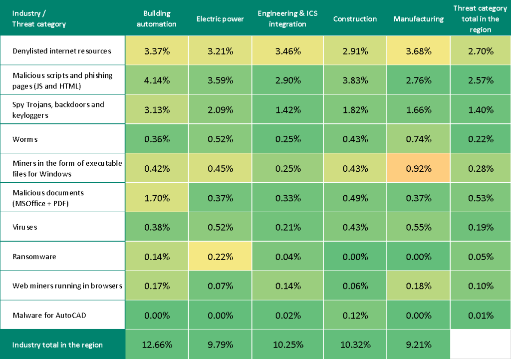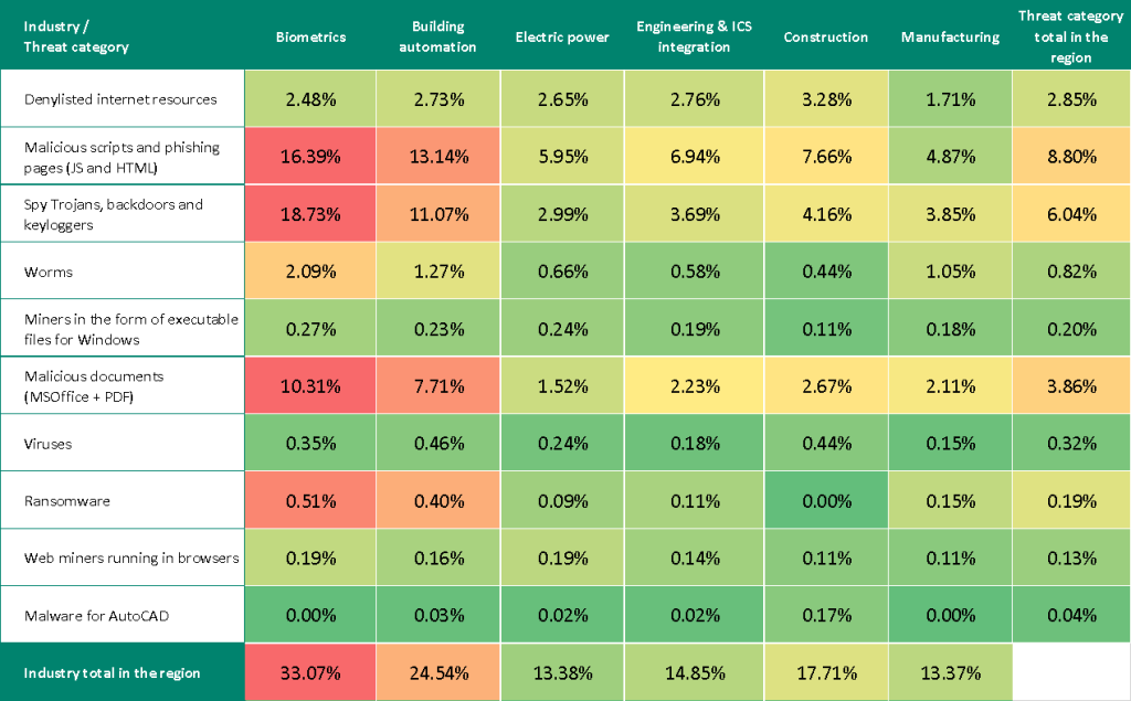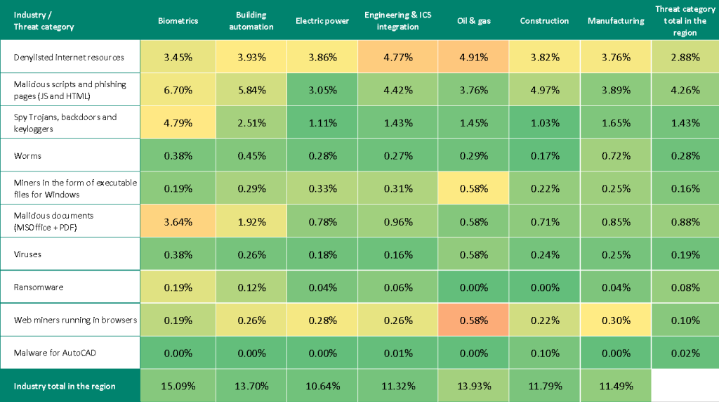 The threat of targeted attacks in the region are especially relevant for the building automation industry. Based on the indicators for malicious documents and spyware in this industry, Eastern Europe occupies third place among regions, and it ranks fourth in malicious scripts and phishing pages.