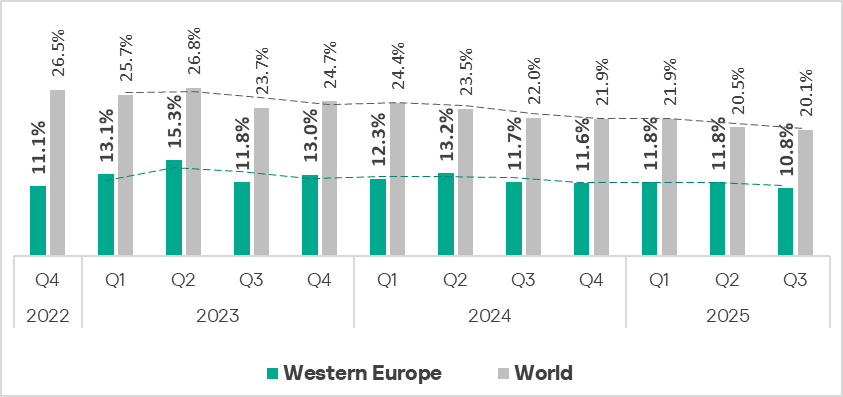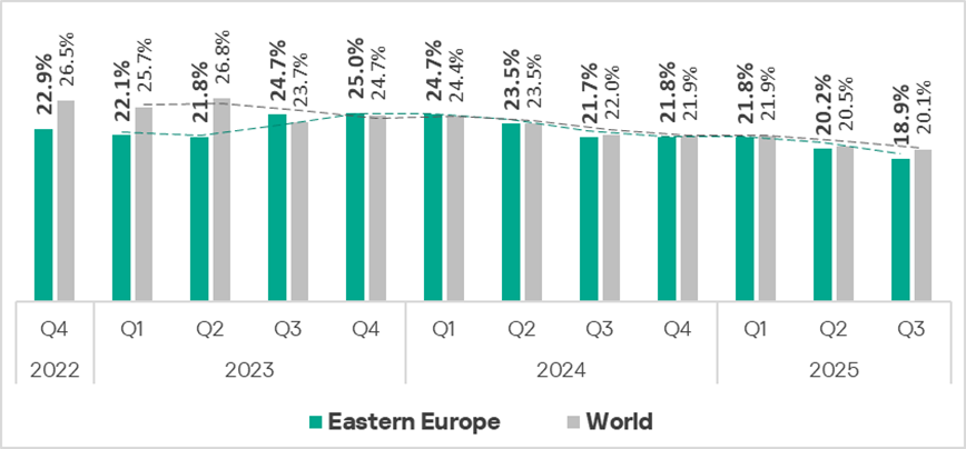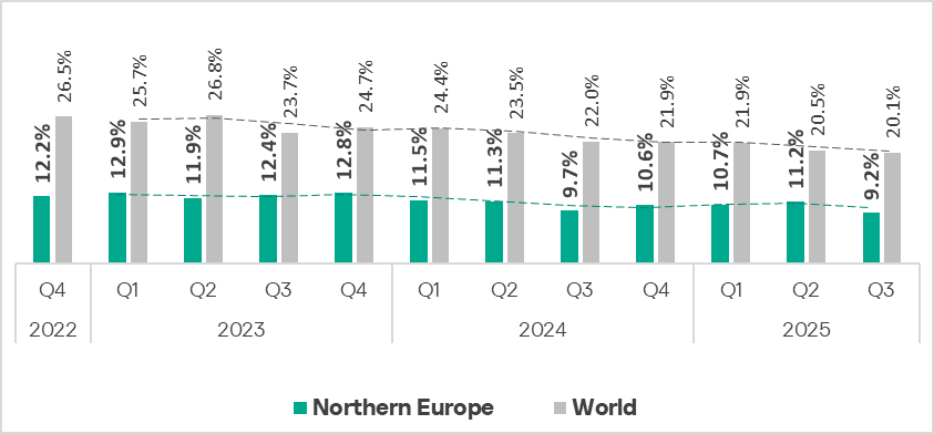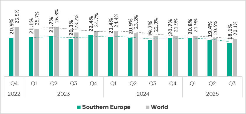 In Q3 2025, the indicator in the region decreased to 18.9%, which is the lowest value over three years. It is slightly lower than the global average and is 2.1 times higher than in Northern Europe, which has the lowest figure among regions.