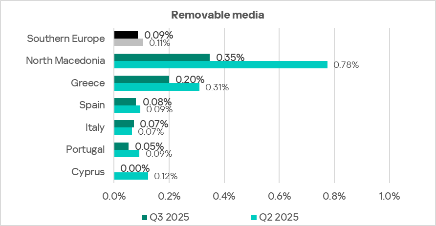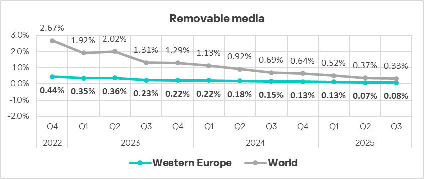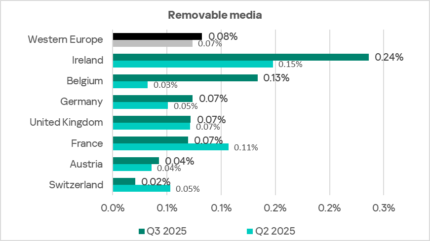 In terms of ICS computers where threats were blocked when connecting removable media, Eastern Europe ranked seventh globally in Q3 2025, at 0.20%. This is 4.0 times higher than the Australia and New Zealand region, which ranks last in the corresponding ranking.