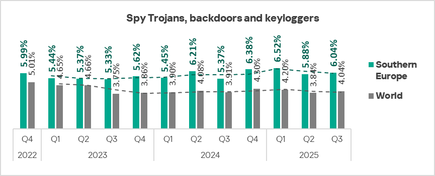 - Third place in the following threat categories: spyware, miners in the form of executable files for Windows, worms, and viruses.