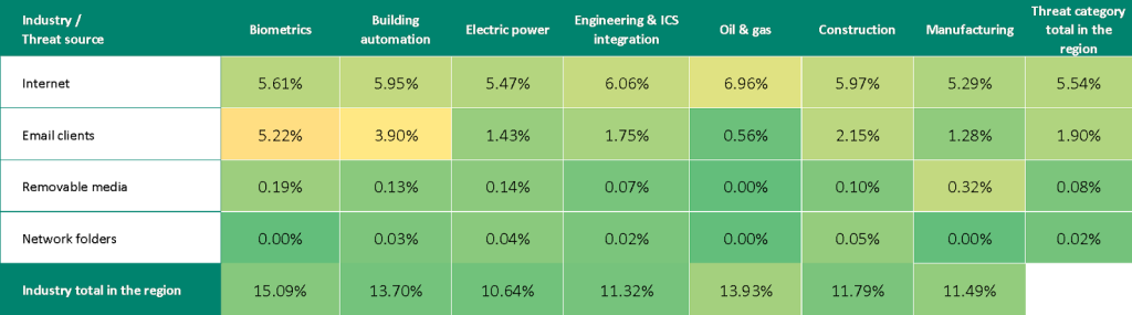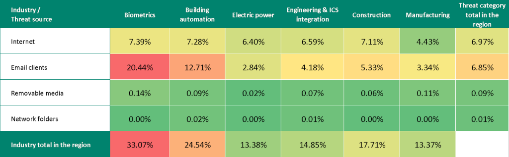 High levels of email threats (phishing) and spyware clearly indicate that industrial systems in the region are highly exposed to advanced attackers.