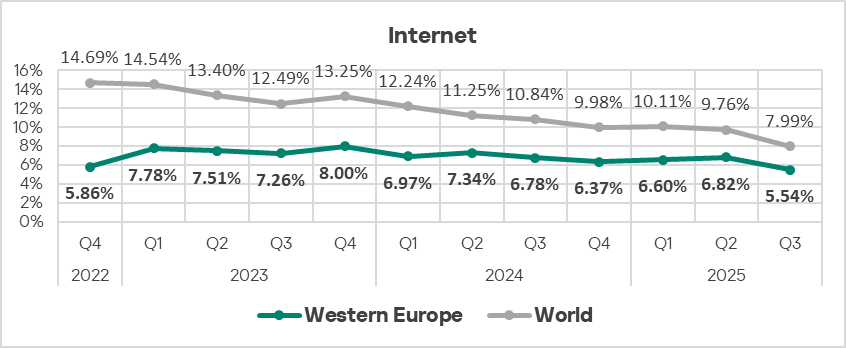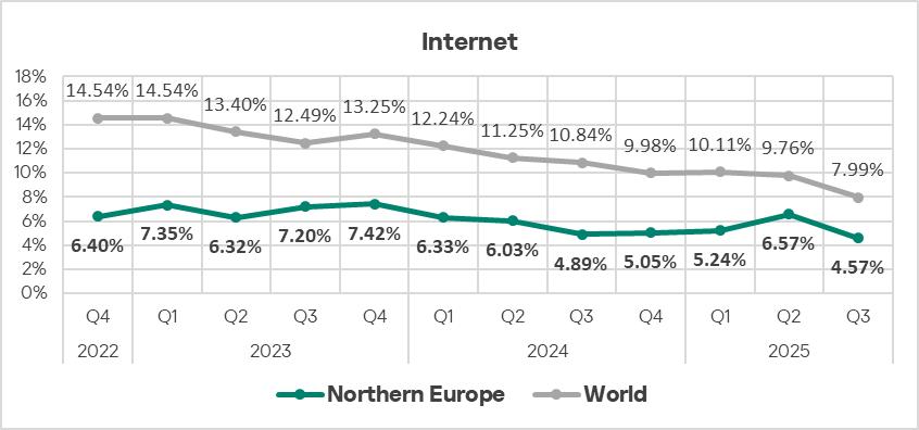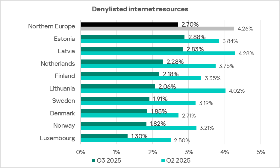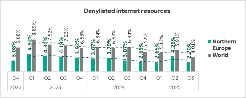 In Q3 2025, just like in all regions, Northern Europe saw a decrease in the percentage of ICS computers on which denylisted internet resources were blocked.