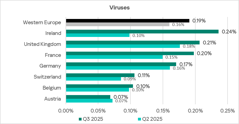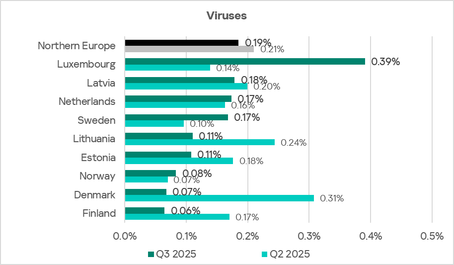 Among countries of the region, based on the percentage of ICS computers on which viruses were blocked, Luxembourg leads with a wide margin after its indicator increased by a factor of 2.8 to 0.39% over the quarter. Latvia holds second place with 0.18%. In addition to Luxembourg, the indicator grew in Sweden, the Netherlands, and Norway.