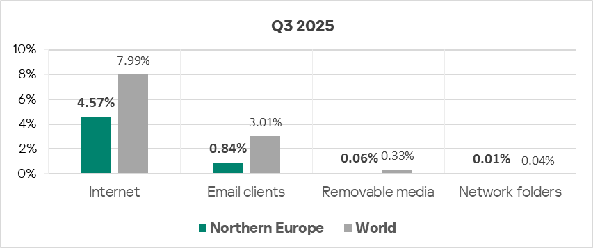 In Q3 2025 in Northern Europe, the percentage of ICS computers on which malicious objects were blocked fell across all threat sources.
