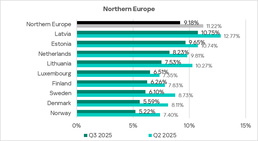 Among the region’s countries, Latvia leads in the percentage of ICS computers with blocked malicious objects, at 10.75%. The lowest figure observed was in Norway at 5.22%. This indicator decreased in all countries over the quarter.
