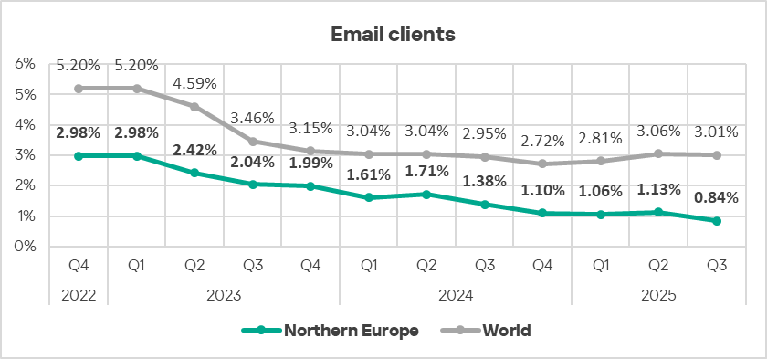 Based on the percentage of ICS computers on which threats from email clients are blocked, Northern Europe ranked 13th among regions in Q3 2025.