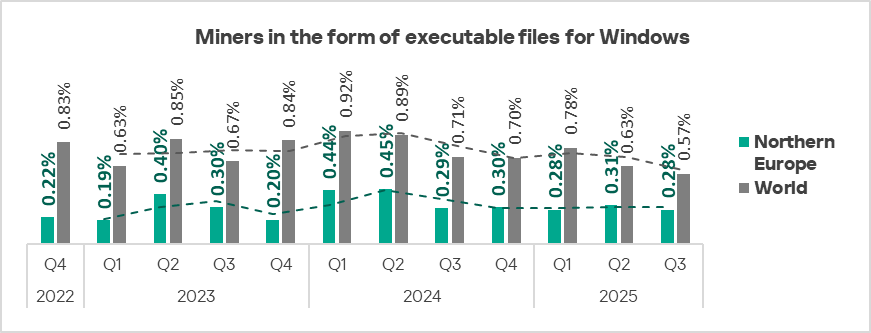 The highest position of Northern Europe in the rankings is for miners in the form of executable files for Windows.