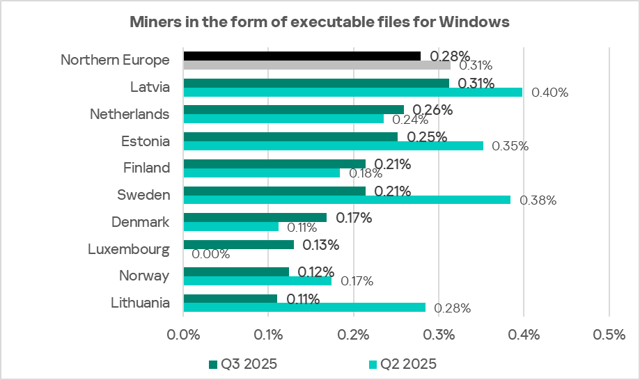 Among countries of the region, Latvia leads with 0.31% in the percentage of ICS computers on which miners in the form of executable files for Windows are blocked. Over the quarter, this indicator grew in the Netherlands, Finland, Denmark, and Luxembourg.