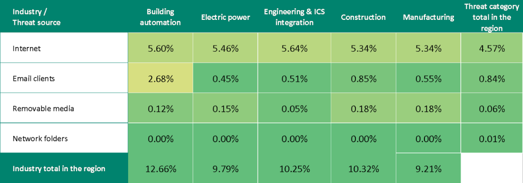 In Eastern Europe, the percentage of ICS computers on which threats from email clients were blocked is 1.3 times higher than the global average.