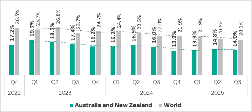 The percentage of ICS computers on which malicious documents were blocked fluctuates in the region. The indicator increased in Q3 2025. It should be mentioned that it grew only in three regions other than Australia and New Zealand.