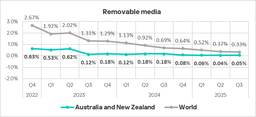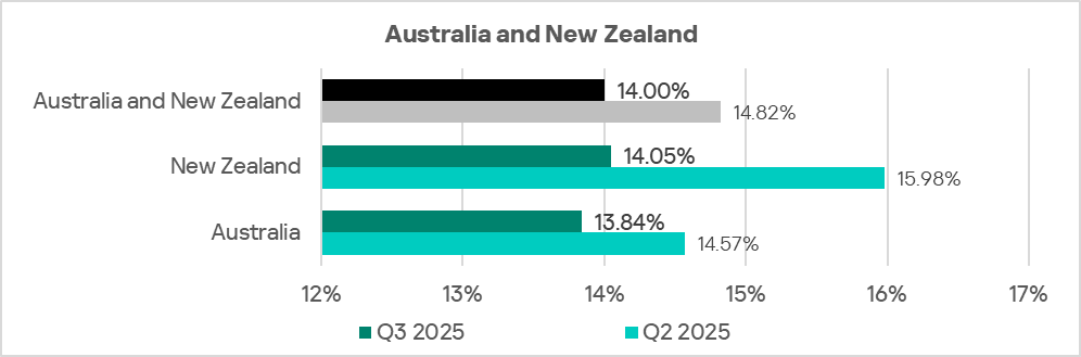 Based on the percentage of ICS computers on which threats on removable media were blocked in Q3 2025, the Australia and New Zealand region ranked 14th with the lowest indicator of all regions (0.05%).