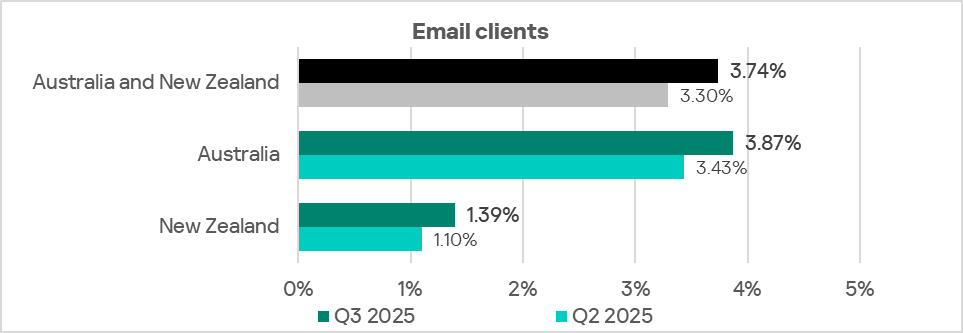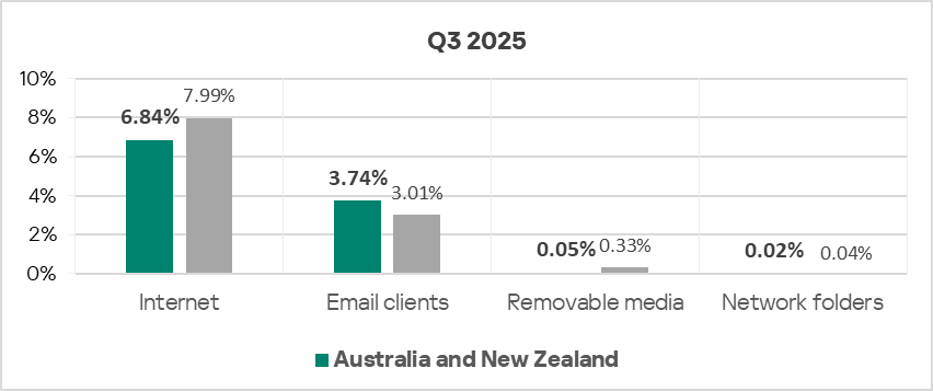 In Q3 2025, the Australia and New Zealand region ranked seventh in the percentage of ICS computers on which threats from email clients were blocked. This is the region’s highest position in the rankings, both by sources and by threat categories.