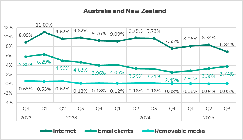 In Q3 2025, the percentage of ICS computers on which malicious objects were blocked in the region increased for all sources of threats except the internet. The Australia and New Zealand region leads in growth of the email client threat indicator while it takes second place in growth of the indicator for threats from network folders.