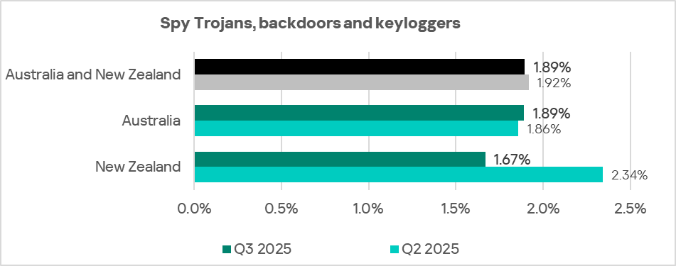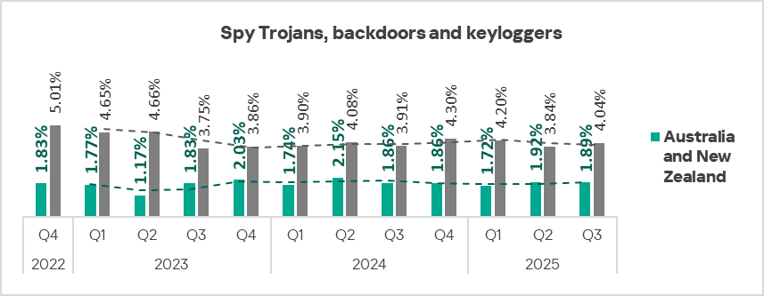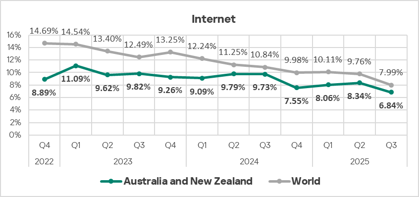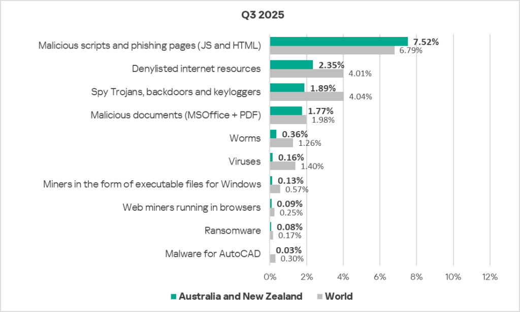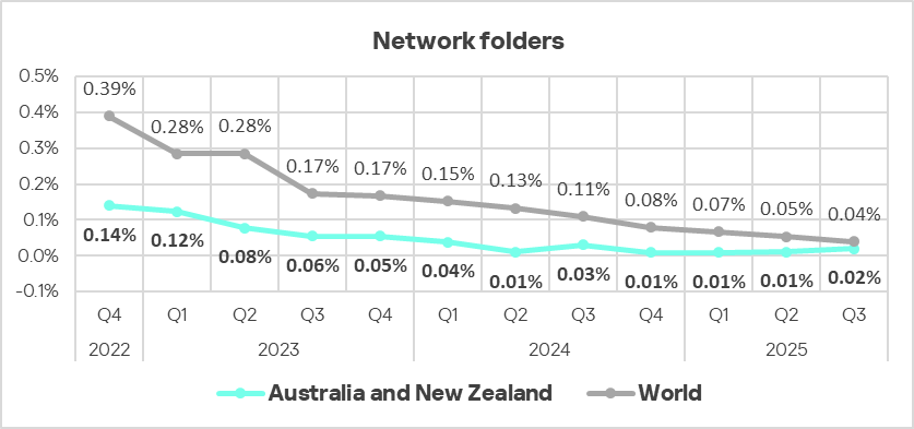 Based on the percentage of ICS computers on which threats in network folders were blocked, the Australia and New Zealand region ranked seventh in Q3 2025 at 0.020%. This is the region’s highest position in the rankings, both by sources and by threat categories.