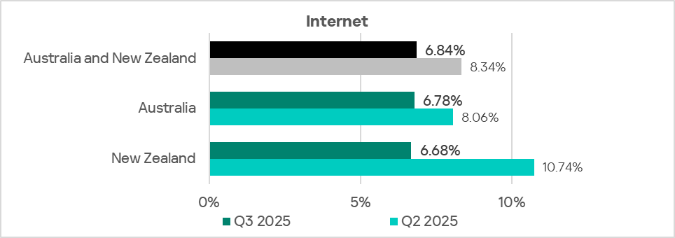 The percentage of ICS computers on which internet threats were blocked during the quarter decreased in both countries of the region. This indicator is higher in Australia than in New Zealand.
