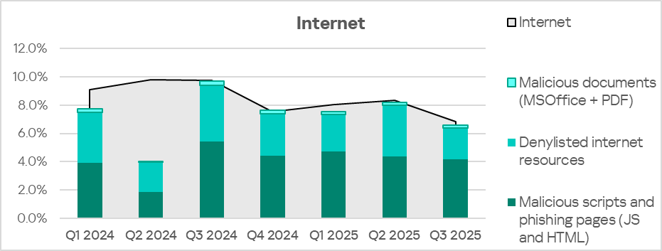 In Q3 2025, the percentage of ICS computers on which malicious scripts and phishing pages were blocked in the region increased to 7.52%. This is 2.9 times higher than in Northern Europe, which boasts the lowest percentage among all regions.