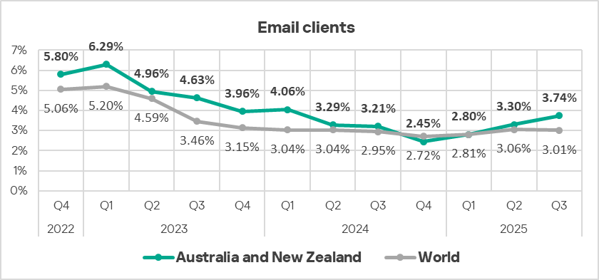 The email clients indicator in the region has been growing for three consecutive quarters. In Q3 2025, Australia and New Zealand occupies first place among regions for this growth.