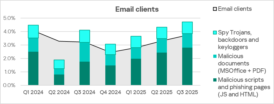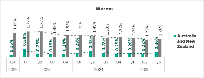 Worms spread through all threat sources. In Q3 2025, they most frequently spread in email clients and removable media.