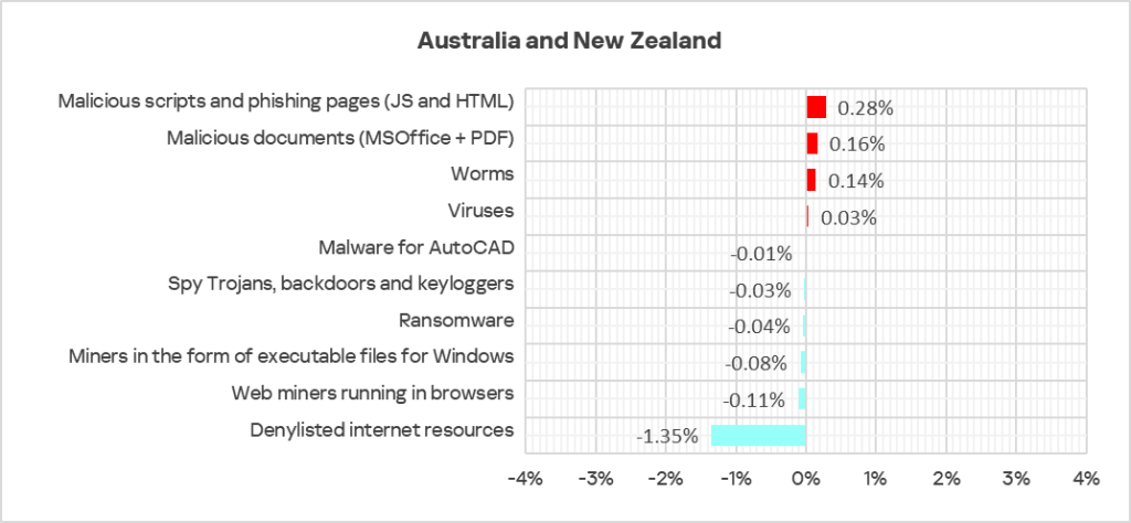 The region’s overall figure largely depends on the situation in Australia. The percentage of ICS computers on which malicious objects were blocked in Australia was lower than in New Zealand. This indicator noticeably decreased in both countries.