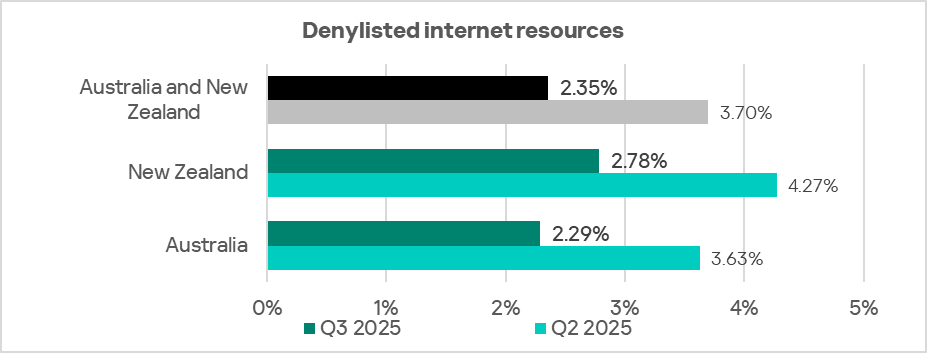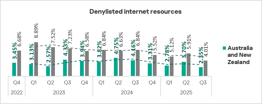 Australia and New Zealand is one of four regions in which the denylisted internet resources category did not drop below second place in the ranking.