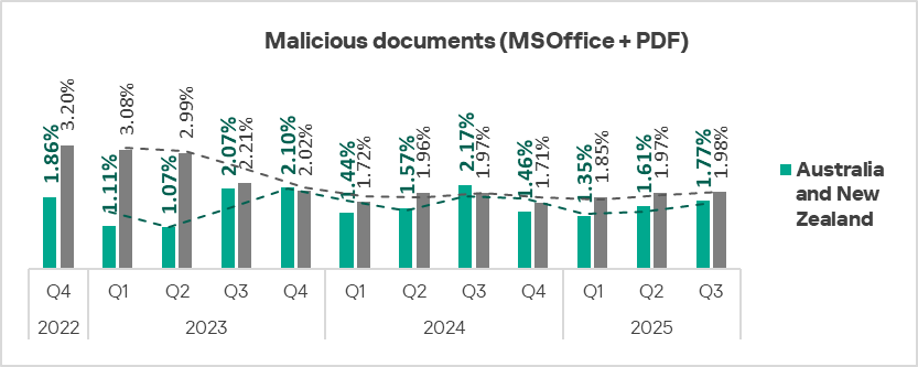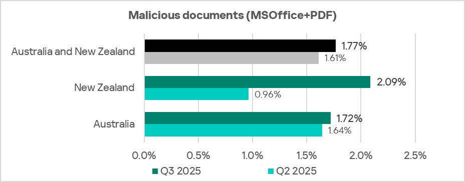 In the previous quarter, the percentage of ICS computers on which malicious documents were blocked was higher in Australia than in New Zealand. In Q3 2025, New Zealand outpaced Australia.