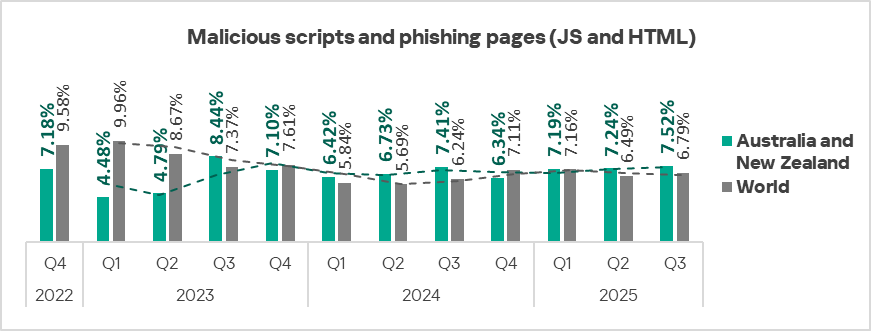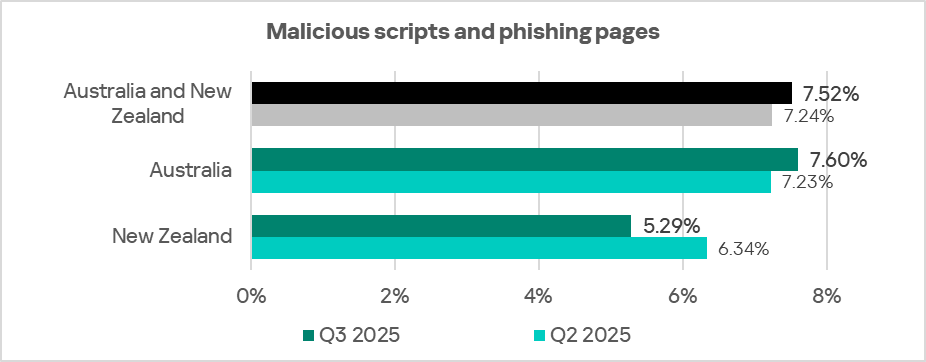 The Australia and New Zealand region occupies seventh place in the percentage of ICS computers on which malicious scripts and phishing pages were blocked. This is the region’s highest position in the rankings, both by sources and by threat categories.