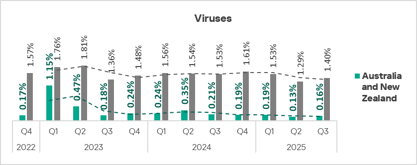 The percentage of ICS computers on which viruses are blocked increased in both countries of the region, particularly increasing by a factor of 3.0 in New Zealand. This indicator in New Zealand was just as high compared to the same indicator in Australia in Q3 2025.