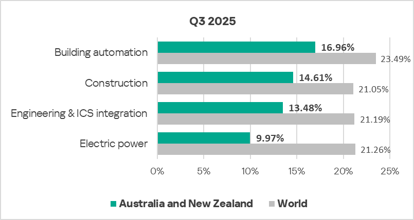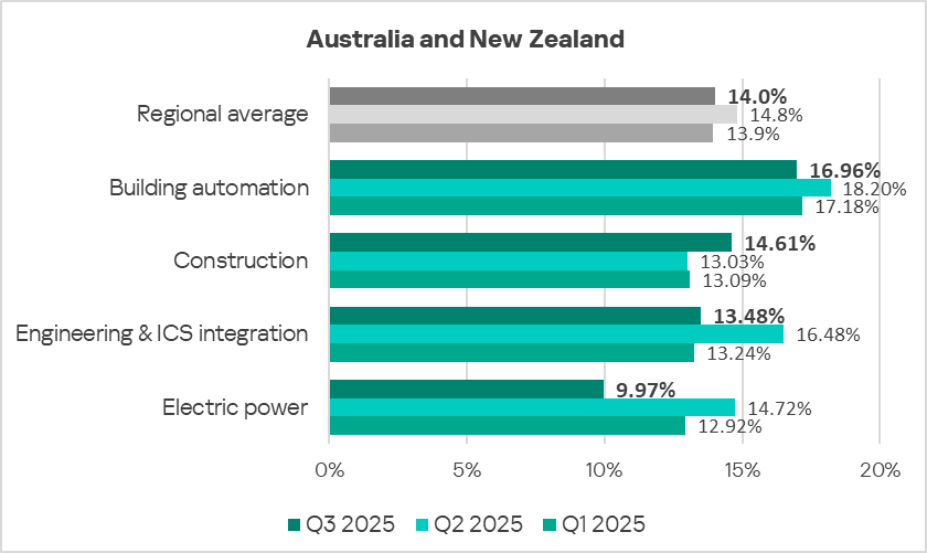 The cybersecurity situation in Australia and New Zealand is among the most favorable across all regions. The region ranked 11th in Q3 2025 based on the percentage of ICS computers on which malicious objects were blocked.