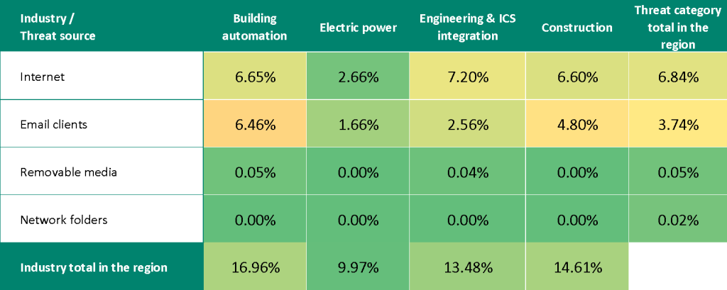 In two industries (construction and electrical energy industry), the region made the top 3 based on industry indicators for email client threats, malicious documents, and malicious scripts.